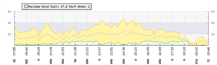 In the last few minutes the wind was West South West at an average speed of 4 kmh, reaching up to 8 kmh and a low of 0 kmh. The gust strength is8 kmh above the minimum speed |