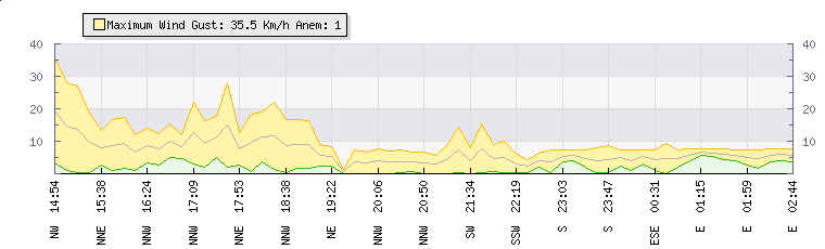 In the last few minutes the wind was North North West at an average speed of 4 kmh, reaching up to 7 kmh and a low of 0 kmh. The gust strength is7 kmh above the minimum speed |