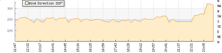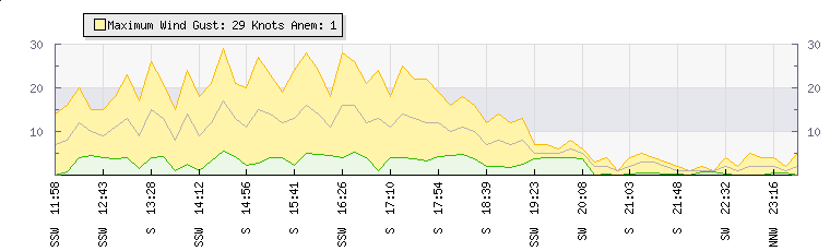 In the last few minutes the wind was Southerly at an average speed of 2 knots, reaching up to 2 knots and a low of 1 knots. The gust strength is1 knots above the minimum speed |