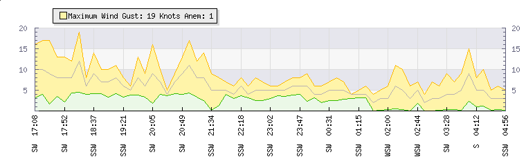 In the last few minutes the wind was West South West at an average speed of 3 knots, reaching up to 5 knots and a low of 0 knots. The gust strength is5 knots above the minimum speed |
