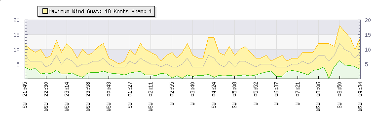 In the last few minutes the wind was Westerly at an average speed of 5 knots, reaching up to 7 knots and a low of 3 knots. The gust strength is4 knots above the minimum speed |