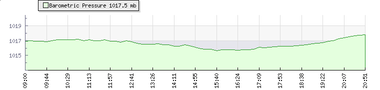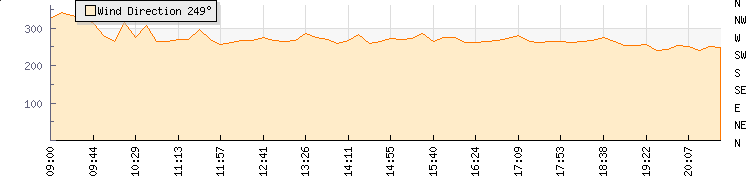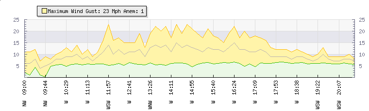 In the last few minutes the wind was Westerly at an average speed of 9 mph, reaching up to 12 mph and a low of 6 mph. The gust strength is6 mph above the minimum speed |