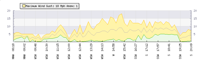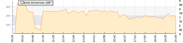 In the last few minutes the wind was Southerly at an average speed of 7 mph, reaching up to 9 mph and a low of 5 mph. The gust strength is4 mph above the minimum speed |