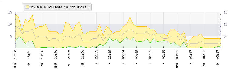 In the last few minutes the wind was Northerly at an average speed of 2 mph, reaching up to 4 mph and a low of 0 mph. The gust strength is4 mph above the minimum speed |