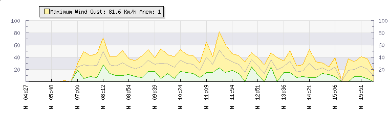 In the last few minutes the wind was Northerly at an average speed of 0 kmh, reaching up to 0 kmh and a low of 0 kmh. The gust strength is0 kmh above the minimum speed |