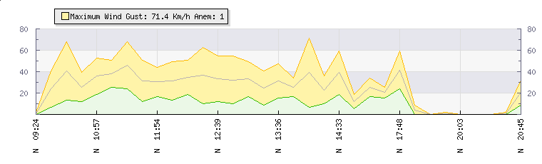 In the last few minutes the wind was Northerly at an average speed of 20 kmh, reaching up to 26 kmh and a low of 15 kmh. The gust strength is11 kmh above the minimum speed |