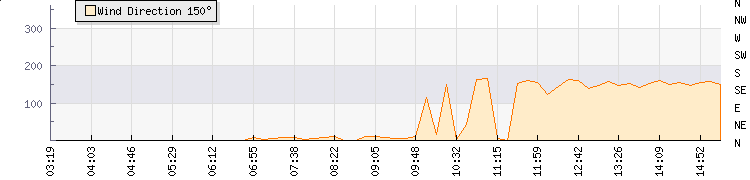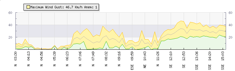 In the last few minutes the wind was South Easterly at an average speed of 33 kmh, reaching up to 46 kmh and a low of 20 kmh. The gust strength is26 kmh above the minimum speed |