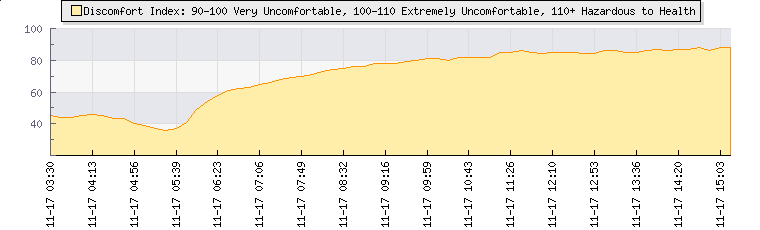| Wind Speed: | 20|33|46 kmh | Wind Direction: | SE 139° | Temperature: | 25.7°C | | Wet Bulb: | 17.8°C | Discomfort: | 87 | Humidity: | 45% | | Rainfall Today: | 0mm | 12 hrs Rainfall: | 0mm | 24 hrs Rainfall: | 0mm | | Barometer: | 1018.9mb | Dew Point: | 12.8°C | Clouds AGL: | 5133ft (1565 m) | | Density-Alt: | 3730ft (1137 m) | Solar Radiation: | 642Wm² | Fire Danger: | |