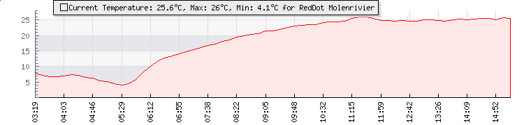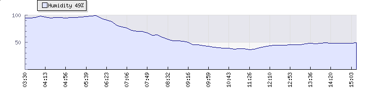 | Wind Gust: | 47 km/h | Min Temp: | 5.1 °C | Max Temp: | 27 °C | | Wind Average: | 34 km/h | Min Hum: | 36 % | Max Hum: | 99 % | |  |