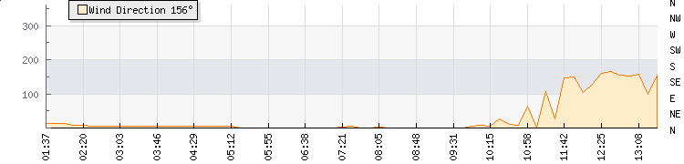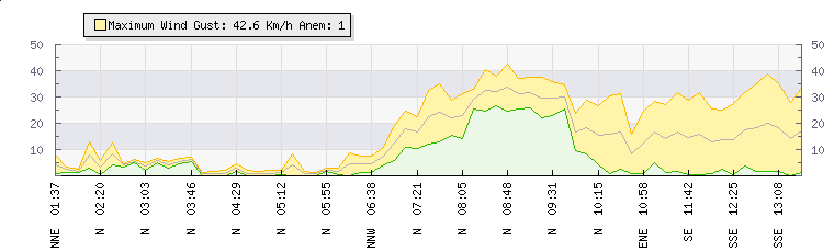 In the last few minutes the wind was East South East at an average speed of 14 kmh, reaching up to 27 kmh and a low of 1 kmh. The gust strength is26 kmh above the minimum speed |