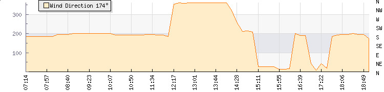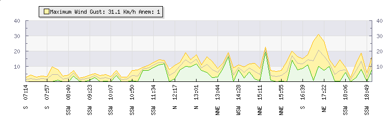 In the last few minutes the wind was North Easterly at an average speed of 17 kmh, reaching up to 26 kmh and a low of 7 kmh. The gust strength is19 kmh above the minimum speed |