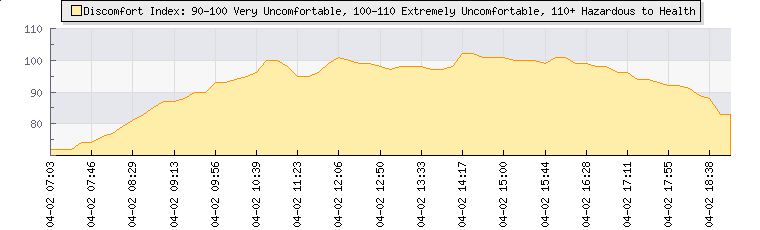 | Wind Speed: | 7|17|26 kmh | Wind Direction: | NE 42° | Temperature: | 28.5°C | | Wet Bulb: | 22°C | Discomfort: | 97 | Humidity: | 56% | | Rainfall Today: | 0mm | 12 hrs Rainfall: | 0mm | 24 hrs Rainfall: | 0mm | | Barometer: | 1017mb | Dew Point: | 18.9°C | Clouds AGL: | 3859ft (1176 m) | | Density-Alt: | 4206ft (1282 m) | Solar Radiation: | 399Wm² | Fire Danger: | |