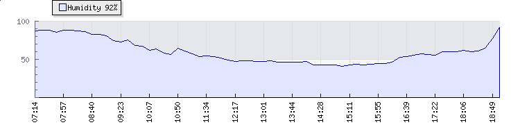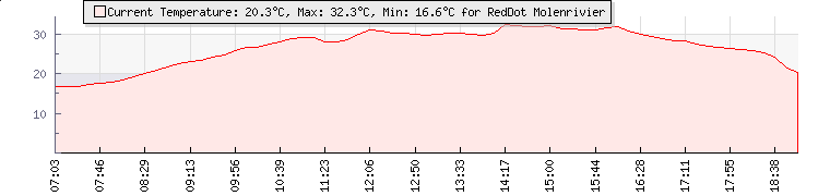 | Wind Gust: | 31 km/h | Min Temp: | 12.7 °C | Max Temp: | 33.3 °C | | Wind Average: | 21 km/h | Min Hum: | 41 % | Max Hum: | 95 % | |  |