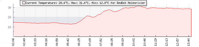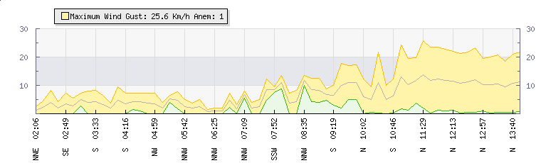 | Wind Gust: | 26 km/h | Min Temp: | 13.9 °C | Max Temp: | 32.4 °C | | Wind Average: | 14 km/h | Min Hum: | 50 % | Max Hum: | 99 % | |  |