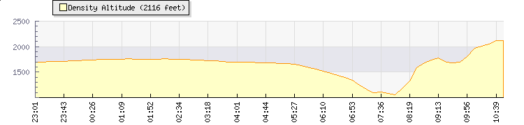 | Wind Speed: | 1|11|22 kmh | Wind Direction: | N 358° | Temperature: | 30.2°C | | Wet Bulb: | 24.4°C | Discomfort: | 103 | Humidity: | 61% | | Rainfall Today: | 0mm | 12 hrs Rainfall: | 0mm | 24 hrs Rainfall: | 0mm | | Barometer: | 1016mb | Dew Point: | 21.8°C | Clouds AGL: | 3349ft (1021 m) | | Density-Alt: | 4485ft (1367 m) | Solar Radiation: | 626Wm² | Fire Danger: | |