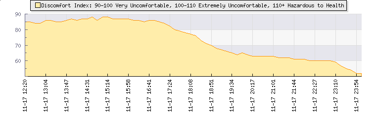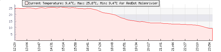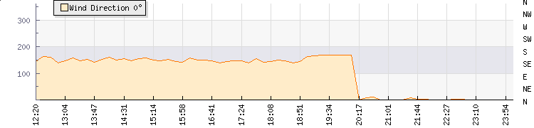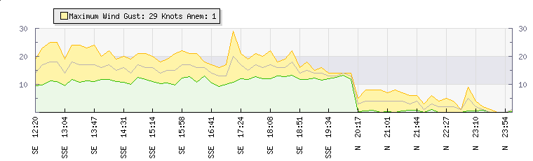 | Wind Gust: | 30 knots | Min Temp: | 5.1 °C | Max Temp: | 27 °C | | Wind Average: | 20 knots | Min Hum: | 36 % | Max Hum: | 99 % | |  |