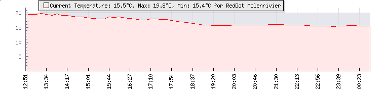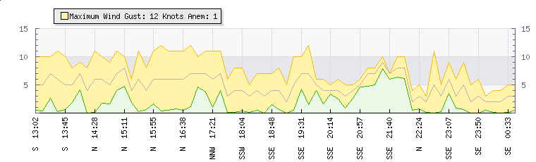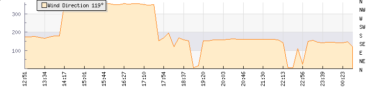 | Wind Gust: | 12 knots | Min Temp: | 13.8 °C | Max Temp: | 21 °C | | Wind Average: | 9 knots | Min Hum: | 90 % | Max Hum: | 100 % | |  |