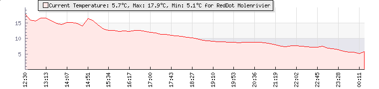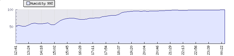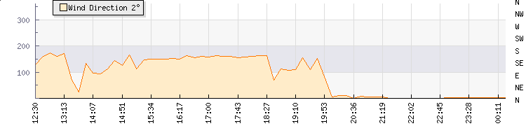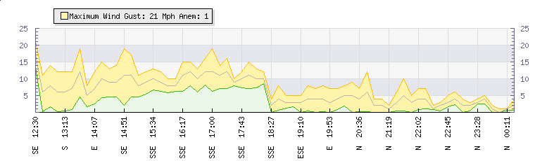 Wind Gust: | 30 mph | Min Temp: | 8.1 °C | Max Temp: | 18.9 °C | Wind Average: | 18 mph | Min Hum: | 46 % | Max Hum: | 98 % | |  |