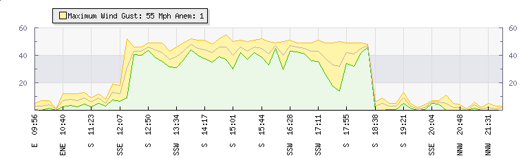 | Wind Gust: | 55 mph | Min Temp: | 8.2 °C | Max Temp: | 31.6 °C | | Wind Average: | 48 mph | Min Hum: | 46 % | Max Hum: | 100 % | |  |