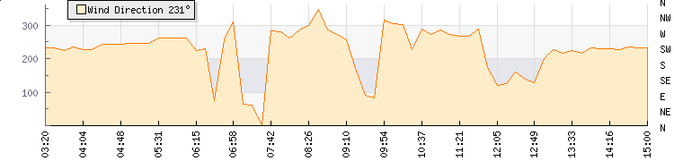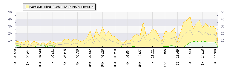 | Last Update: | 2025-10-31 09:10:11 |  | Weather Summary: | In the last few minutes the wind was West South West at an average speed of 8 kmh, reaching up to 15 kmh and a low of 0 kmh.  The gust strength is15 kmh above the minimum speed |  |