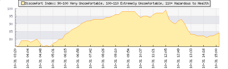 | Wind Speed: | 0|8|15 kmh | Wind Direction: | WSW 255° | Temperature: | 31.5°C |  | Wet Bulb: | 21.2°C | Discomfort: | 99 | Humidity: | 38% |  | Rainfall Today: | 0mm | 12 hrs Rainfall: | 0mm | 24 hrs Rainfall: | 0mm |  | Barometer: | 1008.2mb | Dew Point: | 15.4°C | Clouds AGL: | 6423ft (1958 m) |  | Density-Alt: | 4764ft (1452 m) | Solar Radiation: | 590Wm² | Fire Danger: |  |                   |