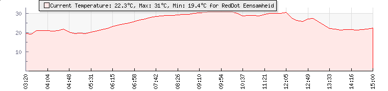 | Wind Gust: | 29 km/h | Min Temp: | 19.4 °C | Max Temp: | 31.5 °C |  | Wind Average: | 15 km/h | Min Hum: | 35 % | Max Hum: | 68 % |  |  |  |  |