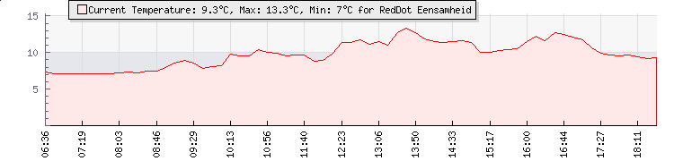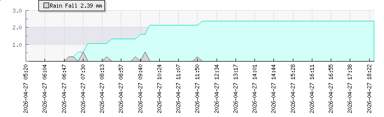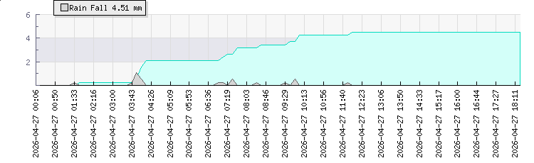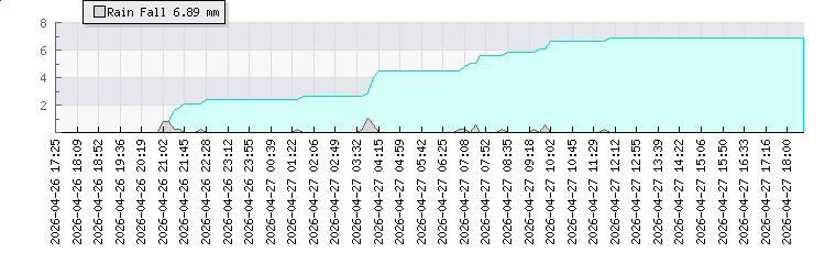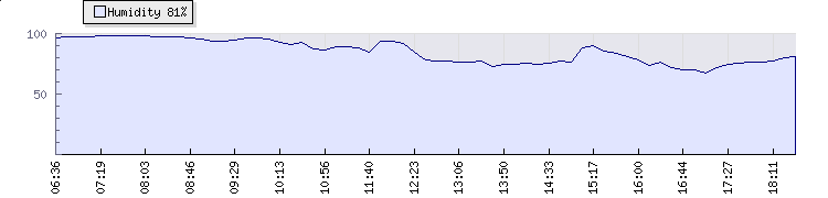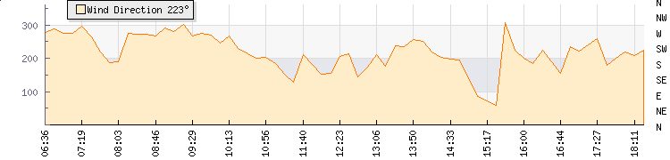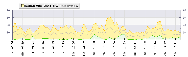 | Wind Gust: | 31 km/h | Min Temp: | 8 °C | Max Temp: | 14.3 °C | | Wind Average: | 17 km/h | Min Hum: | 67 % | Max Hum: | 99 % | |  |