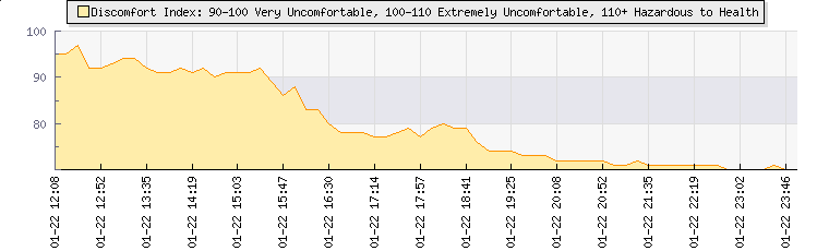 | Wind Speed: | 0|7|14 kmh | Wind Direction: | SW 231° | Temperature: | 17.2°C | | Wet Bulb: | 16.2°C | Discomfort: | 74 | Humidity: | 92% | | Rainfall Today: | 0mm | 12 hrs Rainfall: | 0mm | 24 hrs Rainfall: | 0mm | | Barometer: | 1015.8mb | Dew Point: | 15.9°C | Clouds AGL: | 525ft (160 m) | | Density-Alt: | 2917ft (889 m) | Fire Danger: | |