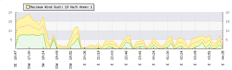 In the last few minutes the wind was South South East at an average speed of 13 kmh, reaching up to 23 kmh and a low of 4 kmh. The gust strength is19 kmh above the minimum speed |