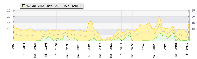 In the last few minutes the wind was Easterly at an average speed of 9 kmh, reaching up to 15 kmh and a low of 3 kmh. The gust strength is12 kmh above the minimum speed |