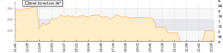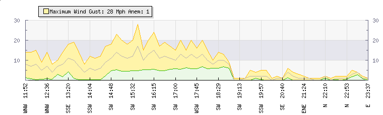 In the last few minutes the wind was South Westerly at an average speed of 17 mph, reaching up to 28 mph and a low of 5 mph. The gust strength is23 mph above the minimum speed |