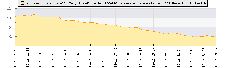 | Wind Speed: | 5|17|28 mph | Wind Direction: | SW 235° | Temperature: | 26.9°C | | Wet Bulb: | 20.9°C | Discomfort: | 93 | Humidity: | 58% | | Rainfall Today: | 0mm | 12 hrs Rainfall: | 0mm | 24 hrs Rainfall: | 0mm | | Barometer: | 1005.5mb | Dew Point: | 17.9°C | Clouds AGL: | 3590ft (1094 m) | | Density-Alt: | 4396ft (1340 m) | Solar Radiation: | 601Wm² | Fire Danger: | |