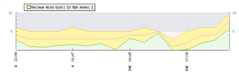 | Wind Gust: | 6 mph | Min Temp: | 16 °C | Max Temp: | 17.4 °C | | Wind Average: | 5 mph | Min Hum: | 97 % | Max Hum: | 100 % | |  |