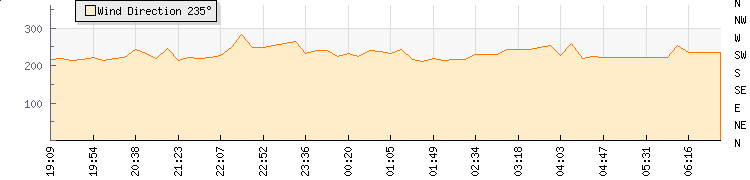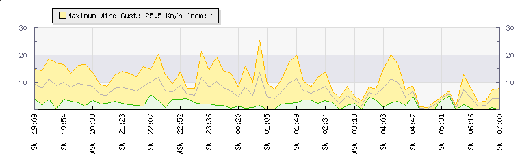 In the last few minutes the wind was South Westerly at an average speed of 6 kmh, reaching up to 7 kmh and a low of 5 kmh. The gust strength is2 kmh above the minimum speed |