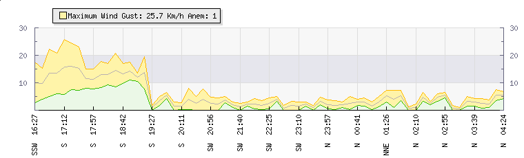 In the last few minutes the wind was Northerly at an average speed of 5 kmh, reaching up to 6 kmh and a low of 3 kmh. The gust strength is3 kmh above the minimum speed |
