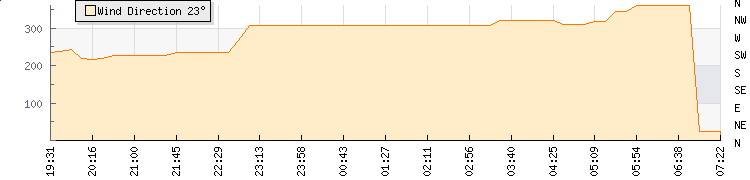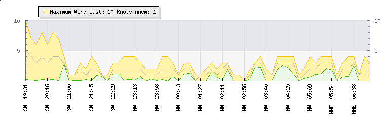 In the last few minutes the wind was North Westerly at an average speed of 1 knots, reaching up to 2 knots and a low of 0 knots. The gust strength is2 knots above the minimum speed |