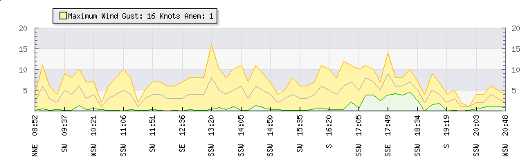 In the last few minutes the wind was South South West at an average speed of 4 knots, reaching up to 8 knots and a low of 0 knots. The gust strength is8 knots above the minimum speed |
