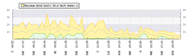 In the last few minutes the wind was East North East at an average speed of 7 kmh, reaching up to 11 kmh and a low of 4 kmh. The gust strength is7 kmh above the minimum speed |