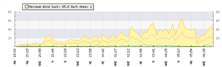 In the last few minutes the wind was North North West at an average speed of 21 kmh, reaching up to 41 kmh and a low of 1 kmh. The gust strength is40 kmh above the minimum speed |