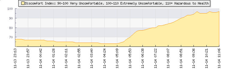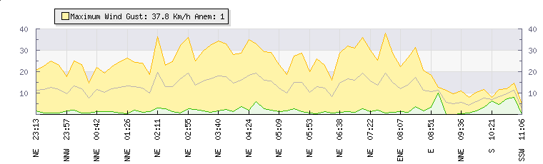 In the last few minutes the wind was Easterly at an average speed of 11 kmh, reaching up to 13 kmh and a low of 10 kmh. The gust strength is3 kmh above the minimum speed |