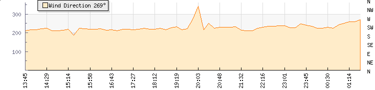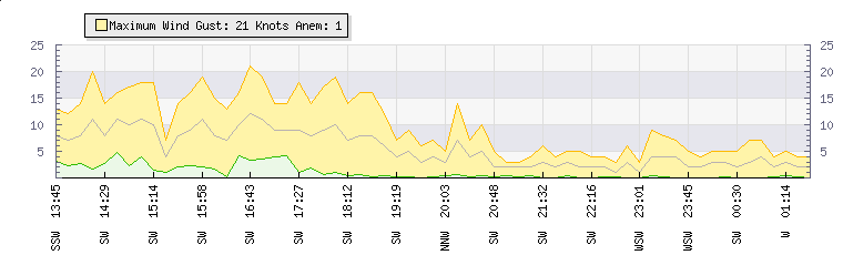 In the last few minutes the wind was South Westerly at an average speed of 3 knots, reaching up to 5 knots and a low of 0 knots. The gust strength is5 knots above the minimum speed |