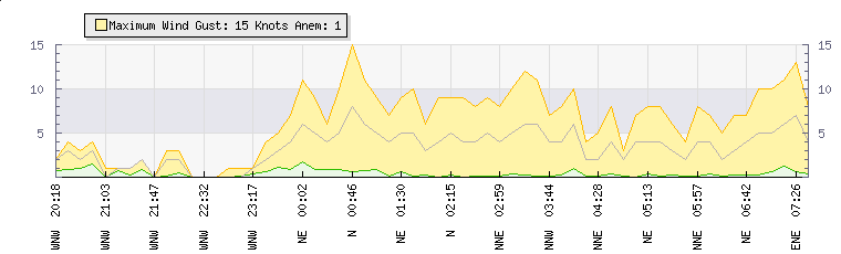 In the last few minutes the wind was North Easterly at an average speed of 5 knots, reaching up to 10 knots and a low of 0 knots. The gust strength is10 knots above the minimum speed |
