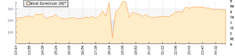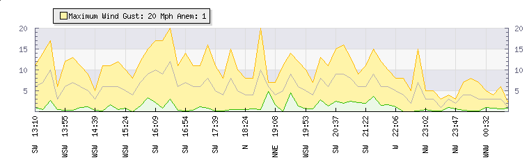 In the last few minutes the wind was North Westerly at an average speed of 3 mph, reaching up to 4 mph and a low of 1 mph. The gust strength is3 mph above the minimum speed |