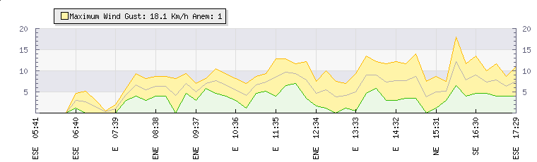 In the last few minutes the wind was Easterly at an average speed of 8 kmh, reaching up to 12 kmh and a low of 4 kmh. The gust strength is8 kmh above the minimum speed |