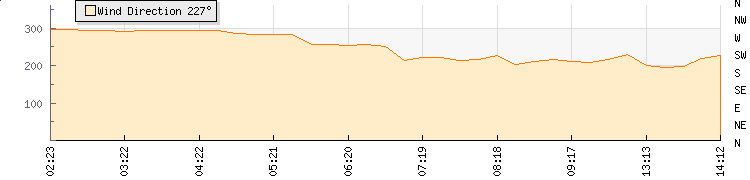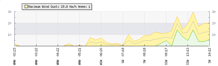 In the last few minutes the wind was South South West at an average speed of 7 kmh, reaching up to 13 kmh and a low of 0 kmh. The gust strength is13 kmh above the minimum speed |