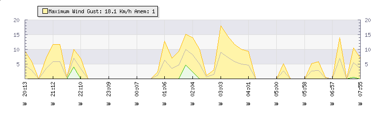 In the last few minutes the wind was Westerly at an average speed of 3 kmh, reaching up to 6 kmh and a low of 0 kmh. The gust strength is6 kmh above the minimum speed |
