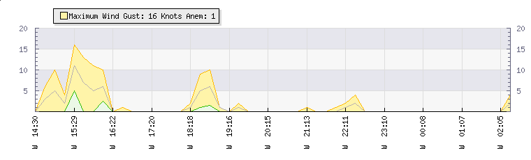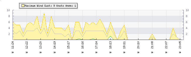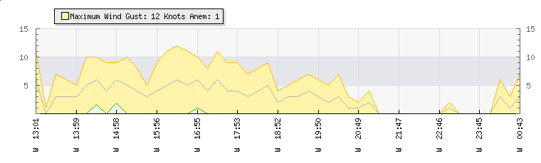 In the last few minutes the wind was Westerly at an average speed of 0 knots, reaching up to 0 knots and a low of 0 knots. The gust strength is0 knots above the minimum speed |