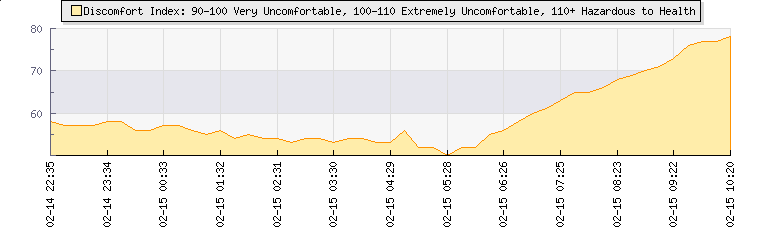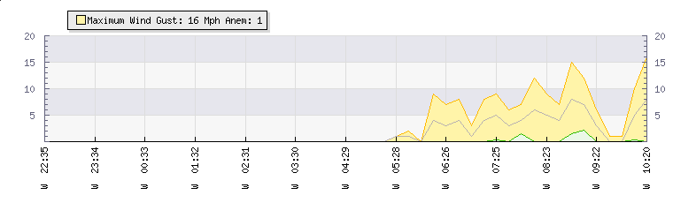 In the last few minutes the wind was Westerly at an average speed of 4 mph, reaching up to 7 mph and a low of 0 mph. The gust strength is7 mph above the minimum speed |