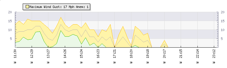 In the last few minutes the wind was Westerly at an average speed of 0 mph, reaching up to 0 mph and a low of 0 mph. The gust strength is0 mph above the minimum speed |
