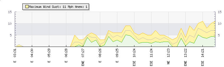 In the last few minutes the wind was Easterly at an average speed of 4 mph, reaching up to 7 mph and a low of 1 mph. The gust strength is6 mph above the minimum speed |